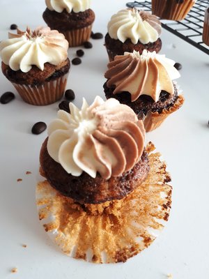 I was having a huge craving for coffee flavoured things (I don’t know where it came from!), and I decided mini cupcakes would be a great way to settle that need. I love little desserts that you can just pop into your mouth! Of course the danger is that you can’t stop at one :p.