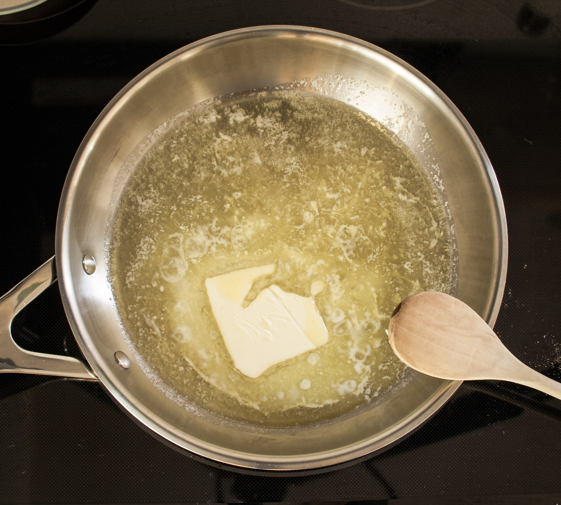 Start by melting your butter on your stove top over medium-low heat. I do it at medium-low because if your pan is too hot when the butter is added, it will immediately brown and burn onto your pan very fast.