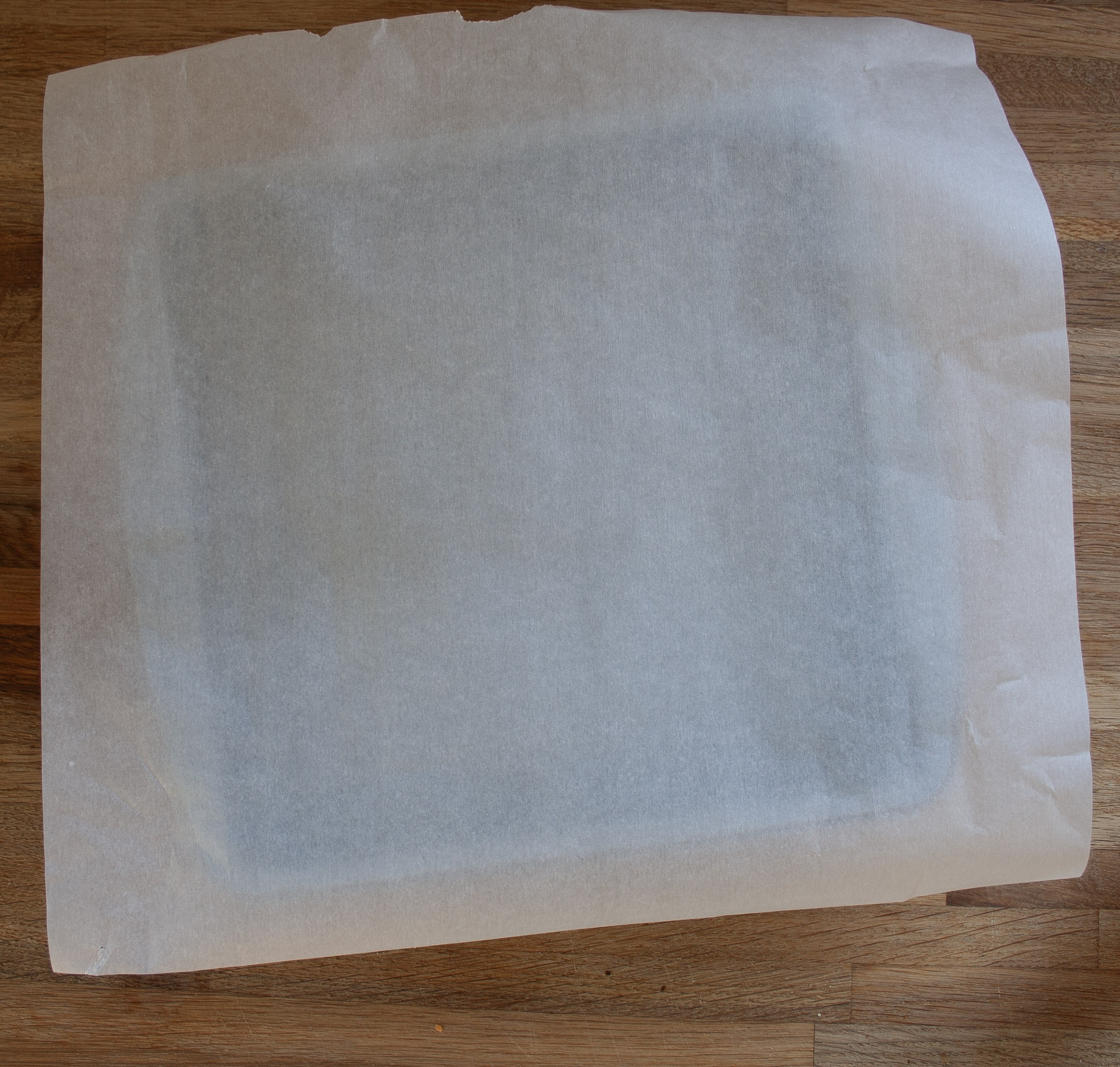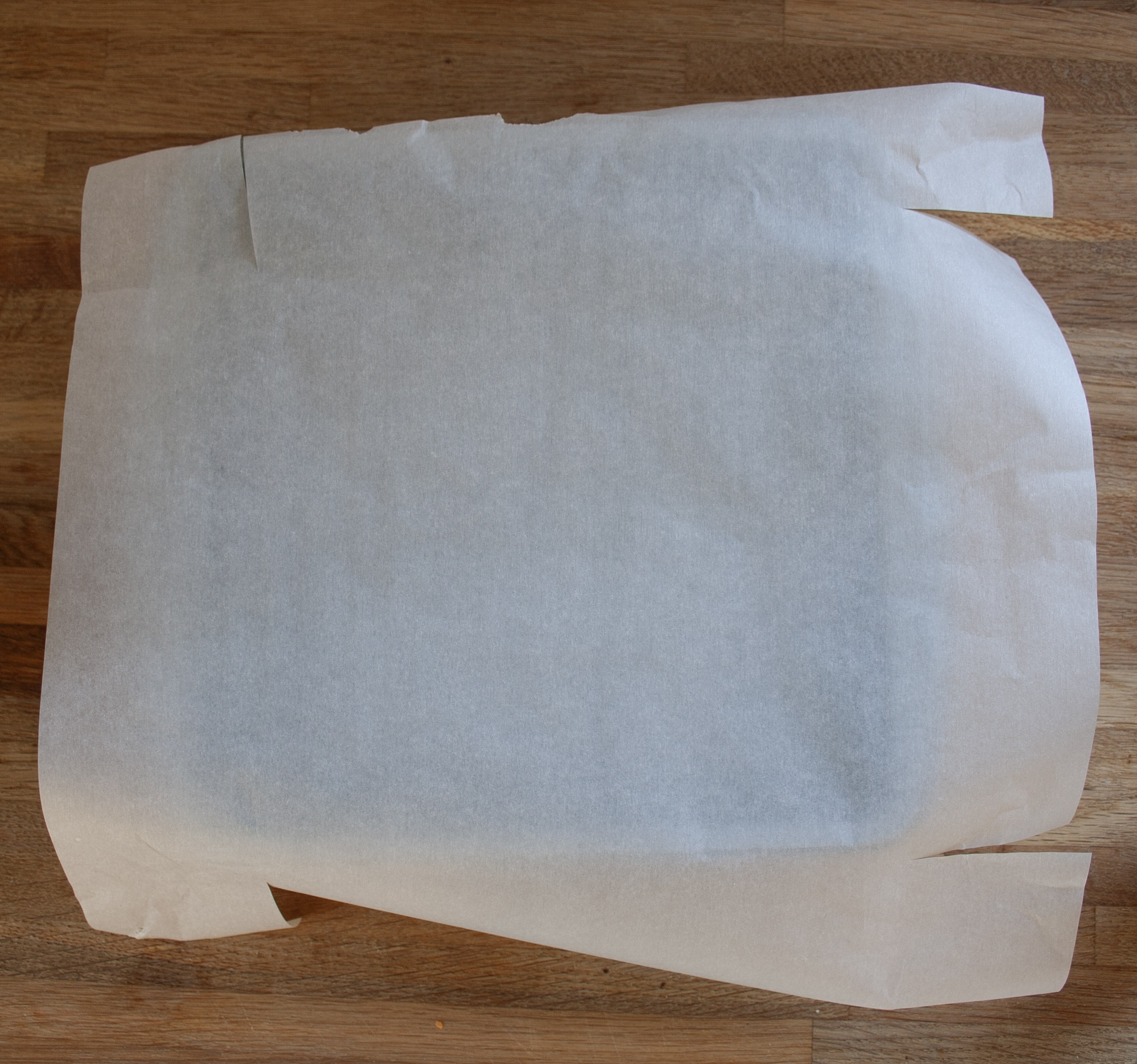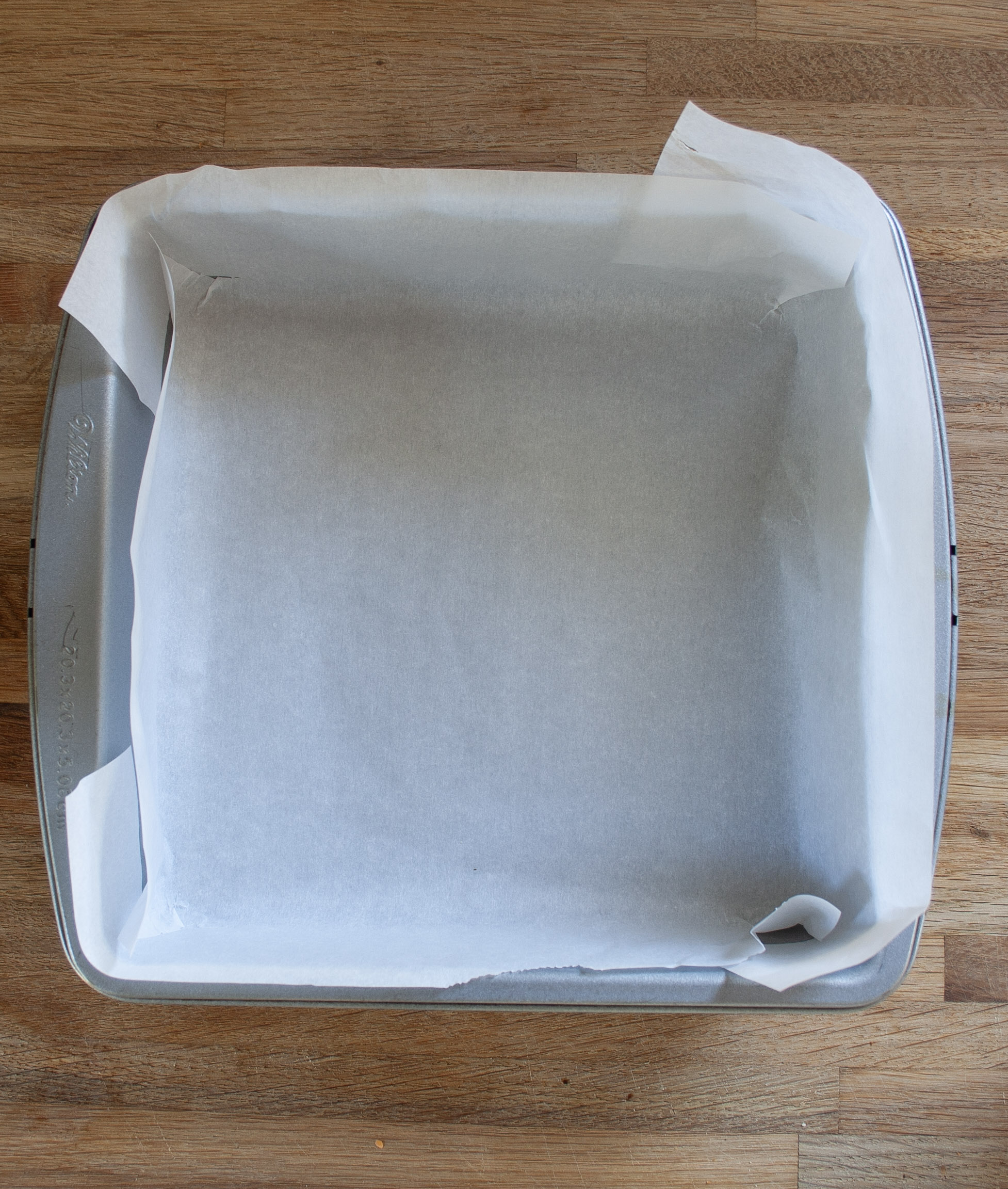 Start with a square piece of parchment paper, about 4 inches larger than your pan both vertically and horizontally. Thus, if your pan is 8×8, you will want a 12×12 piece of parchment. To make it fit within the pan, cut a slit into the parchment paper two inches from each corner, and make the cut two inches long. (see picture). Then fold the extra two inches from each side inwards. So that there is a middle square the size of your pan. Fold the tabs created by the cuts around the side beside it. I know this sounds confusing….hopefully the pictures help this out.