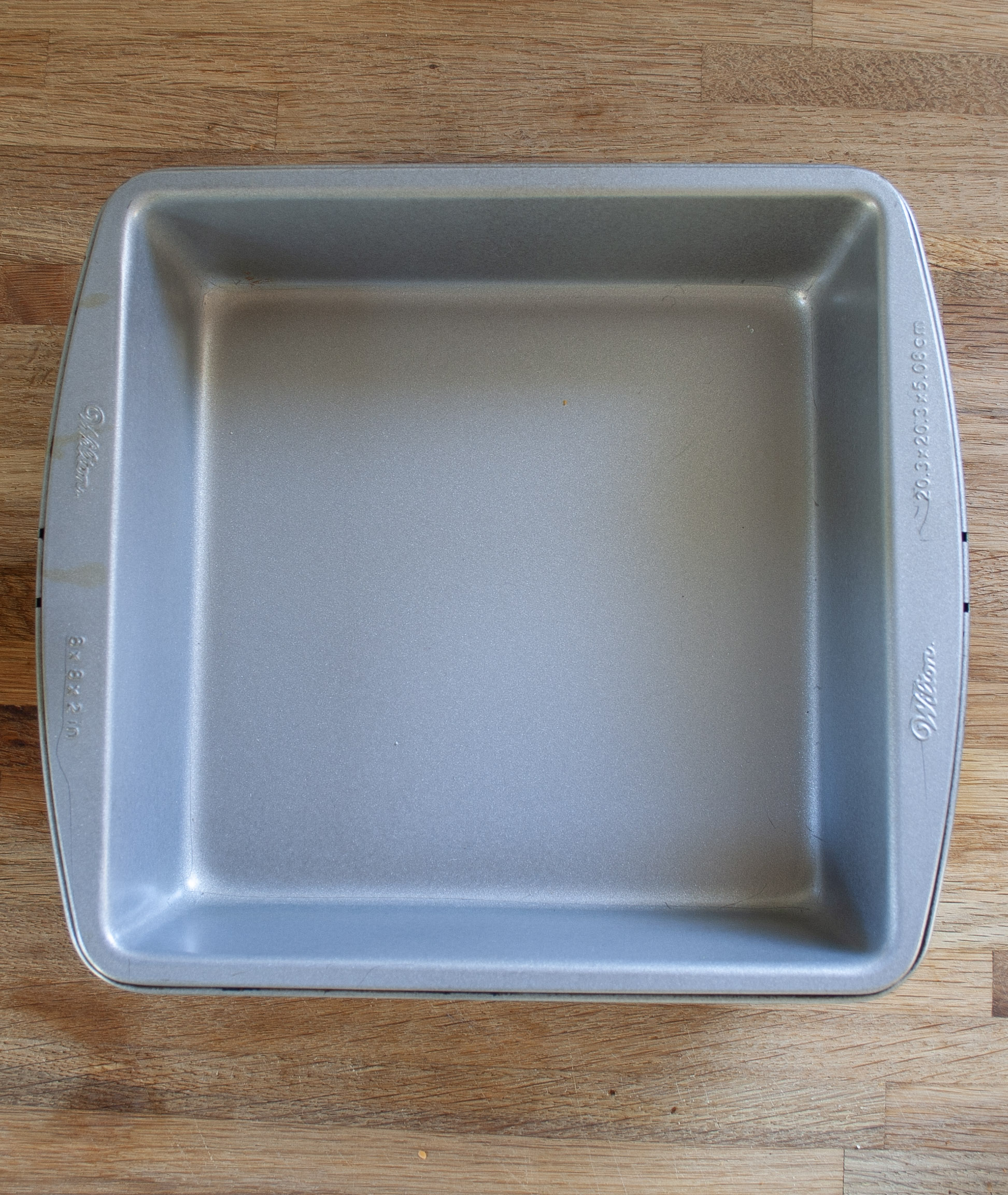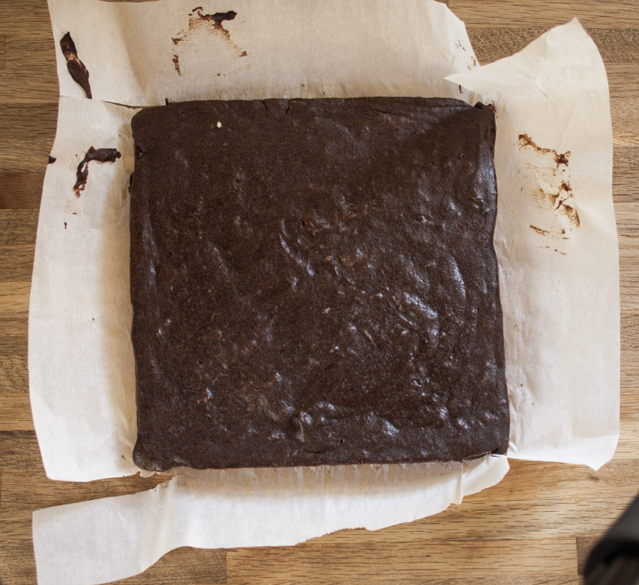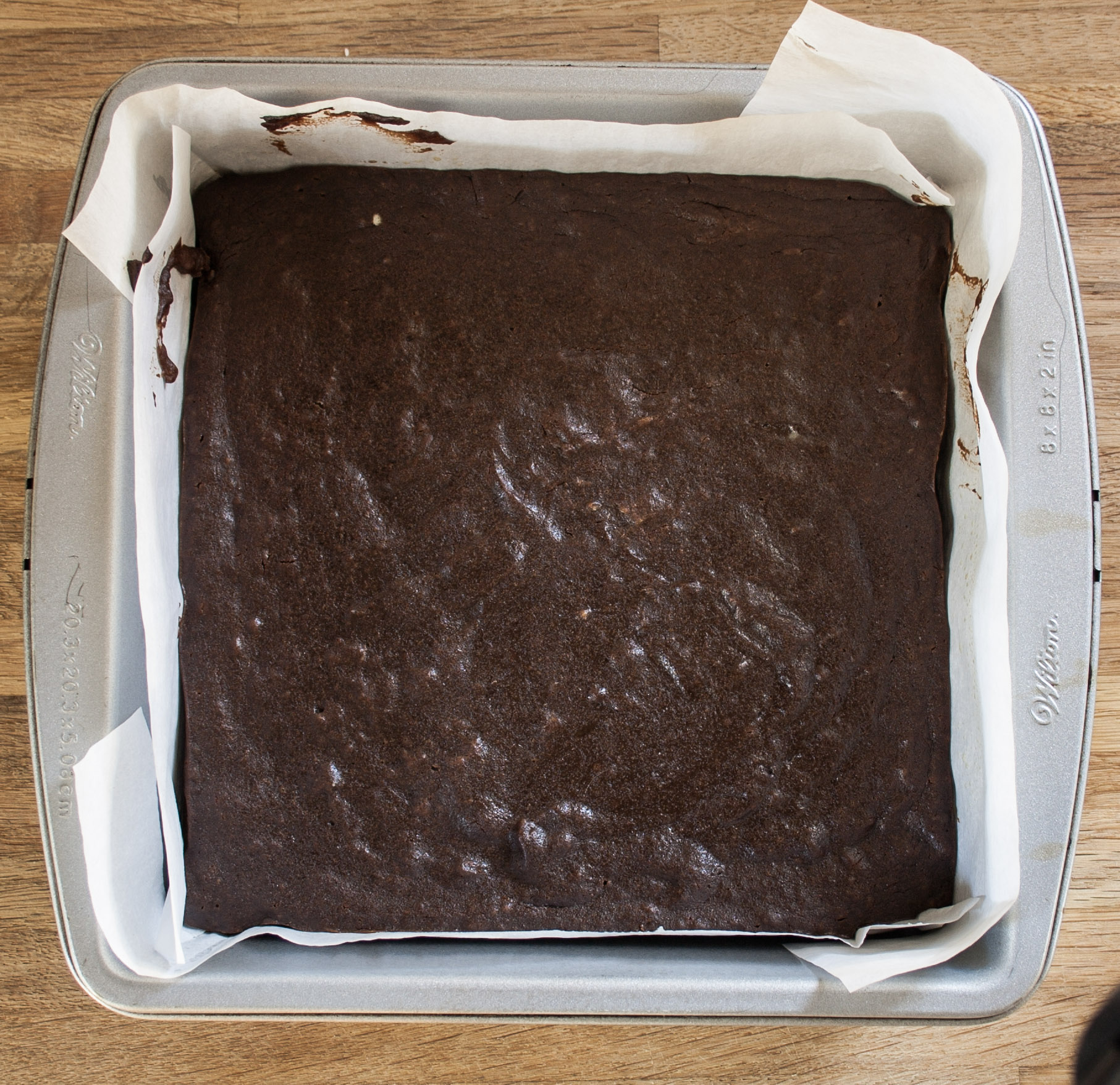 Start with a square piece of parchment paper, about 4 inches larger than your pan both vertically and horizontally. Thus, if your pan is 8×8, you will want a 12×12 piece of parchment. To make it fit within the pan, cut a slit into the parchment paper two inches from each corner, and make the cut two inches long. (see picture). Then fold the extra two inches from each side inwards. So that there is a middle square the size of your pan. Fold the tabs created by the cuts around the side beside it. I know this sounds confusing….hopefully the pictures help this out.