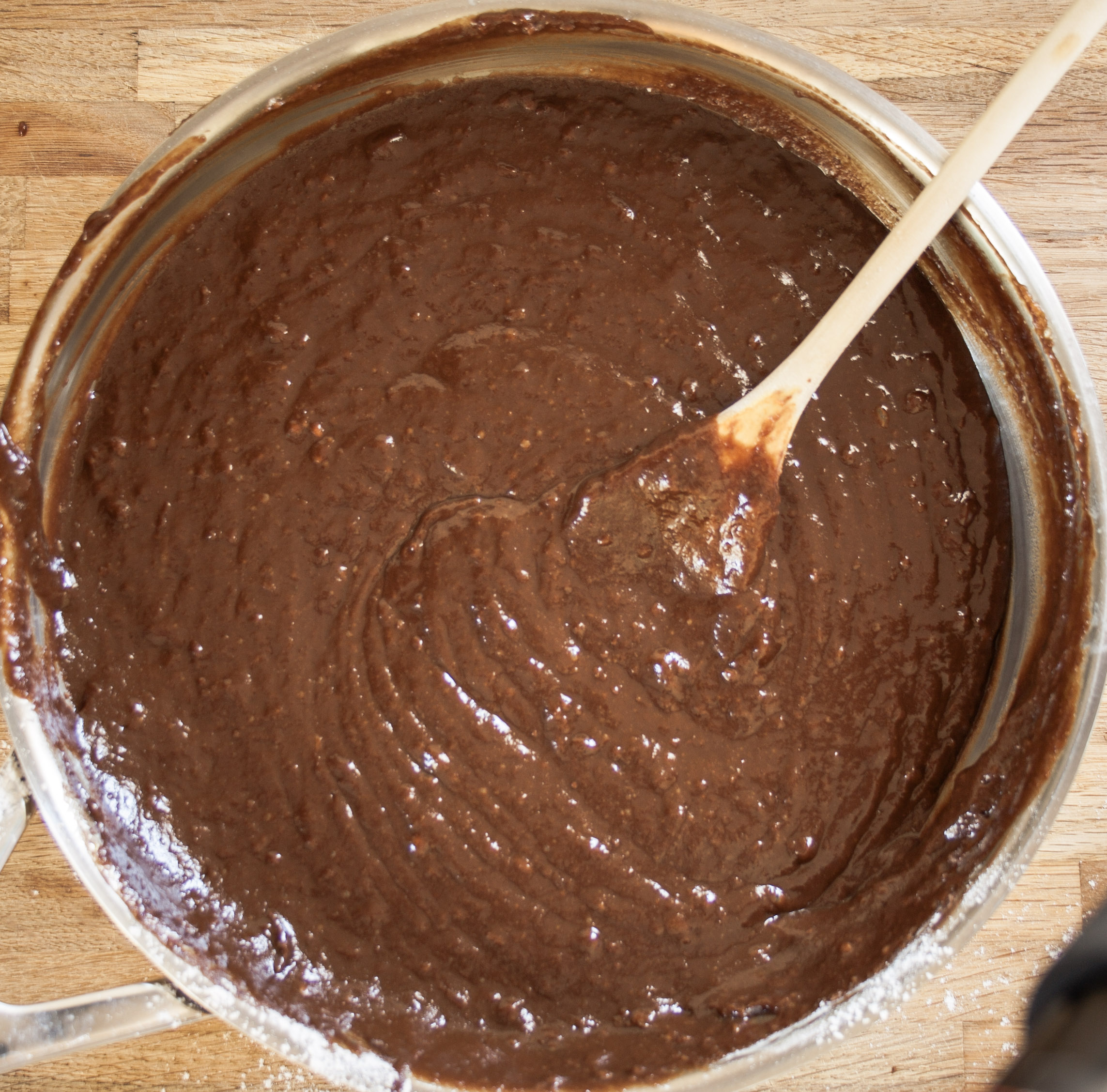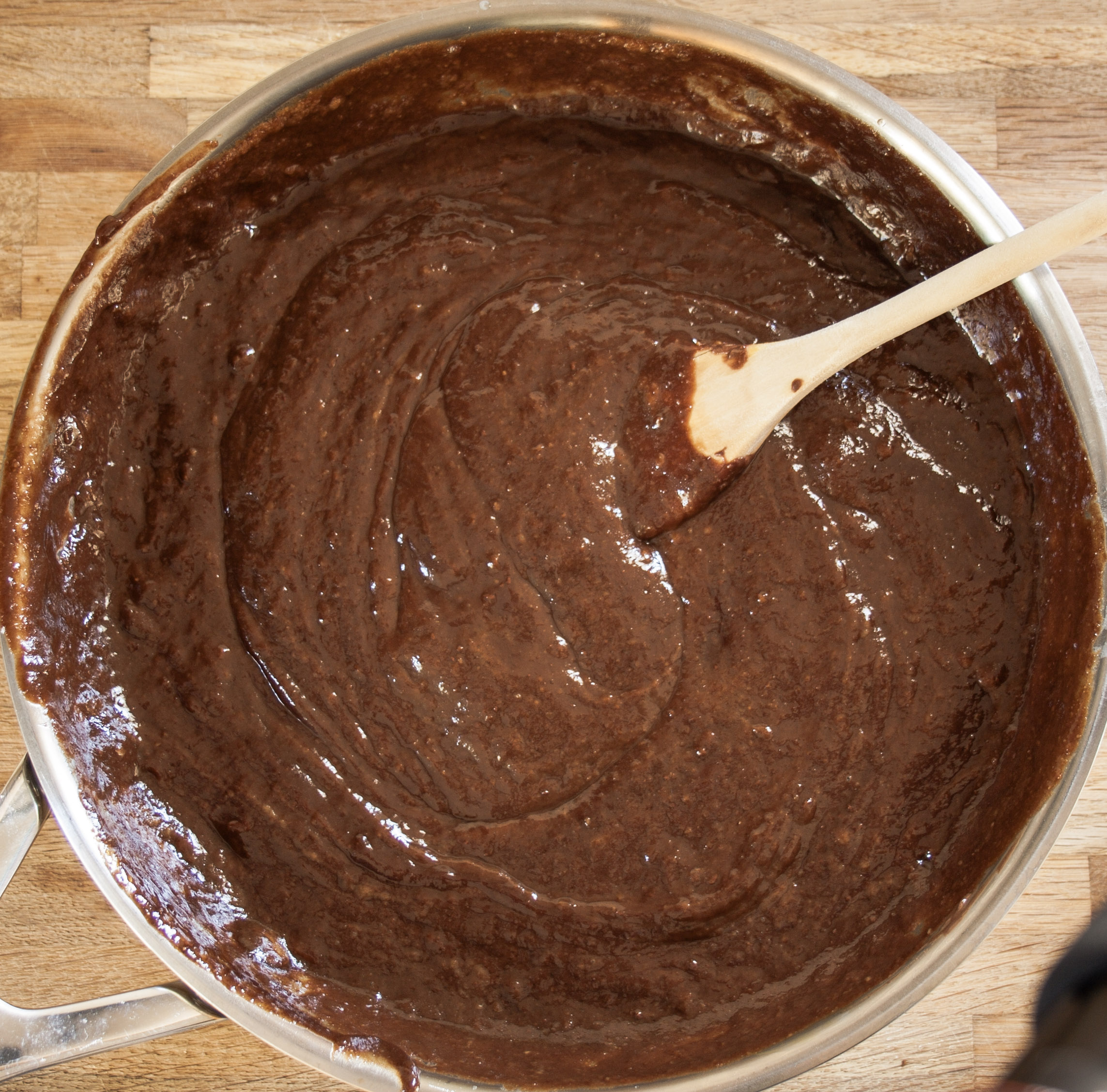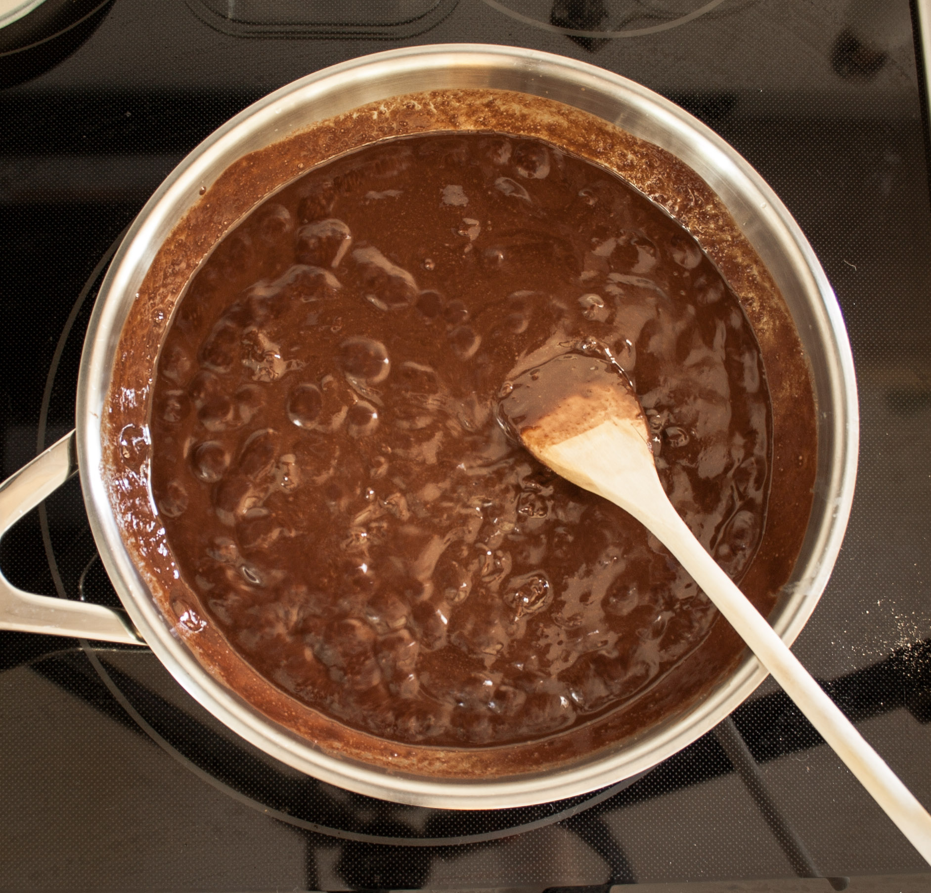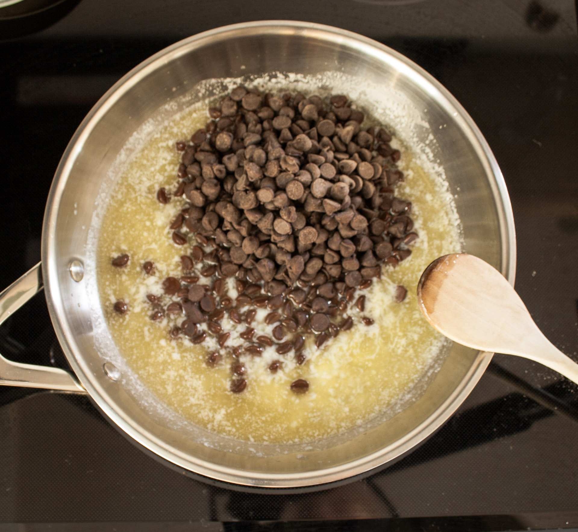 Next add your chocolate chips to the pan, stirring until they are melted. Ensure you do not stop stirring so that the chocolate does not get the opportunity to stick to the bottom of the pan.