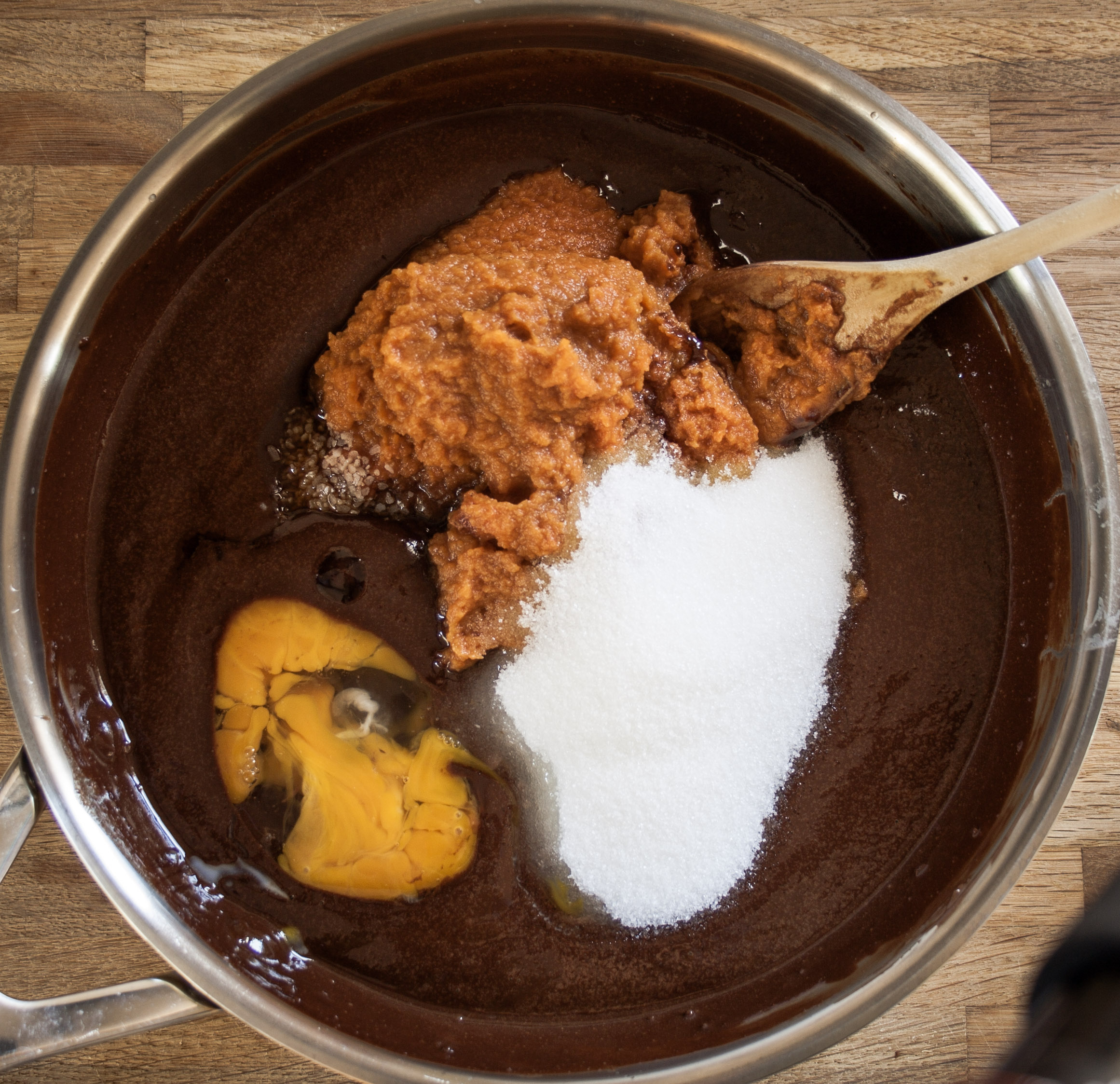 Turn off your stove, and take the pan off the heat. Add the sugar, pumpkin, egg, vanilla, amd salt and mix until combined.