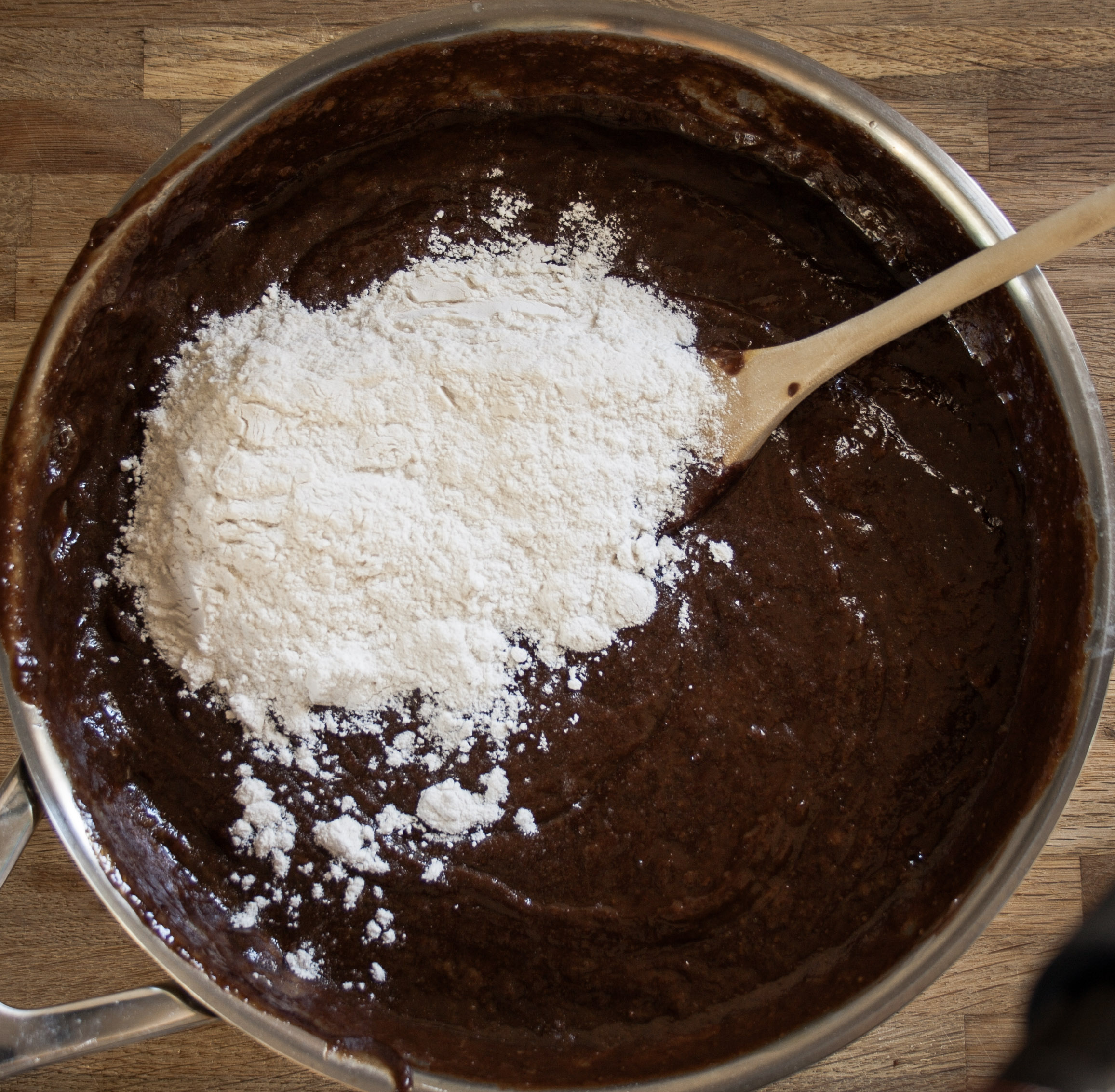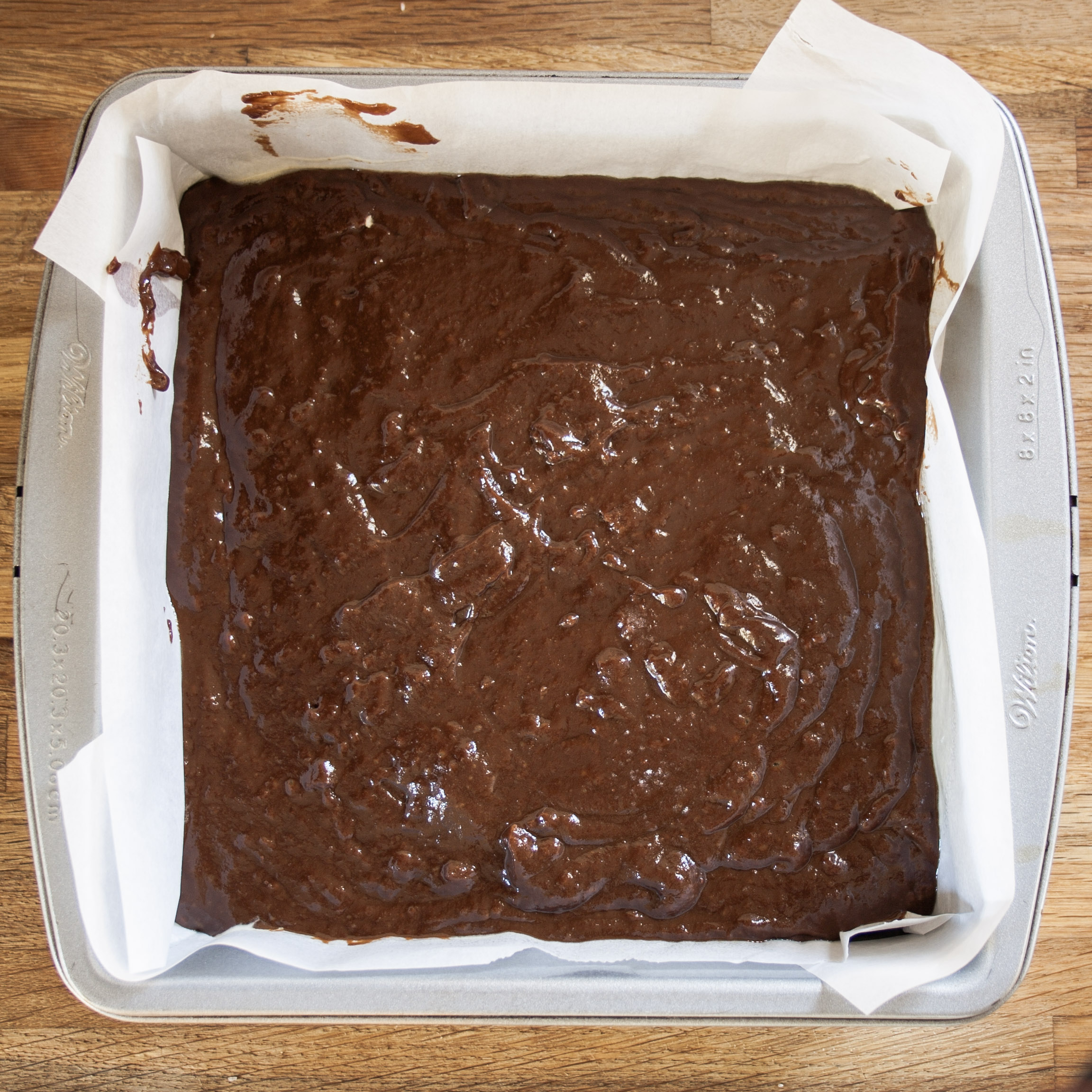Next add the flour and mix until combined. Pour into your prepared baking pan.